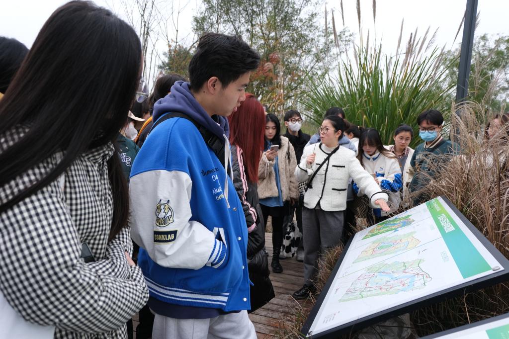 学员们在团委老师吴倩、杨晗的带领下,沿着高峰梯田、东岛头、广阳营、胜利草场、抗战机场遗址等生态修复现场进行实地参观,并观察了山体修复、水体恢复等情况,观赏了广阳岛山丘起伏、溪溏相连、梯田层叠的原生态巴渝乡村田园风光,了解了广阳岛以“护山、理水、营林、疏田、清湖、丰草”为主的生态修复策略以及相关措施带来的成效。