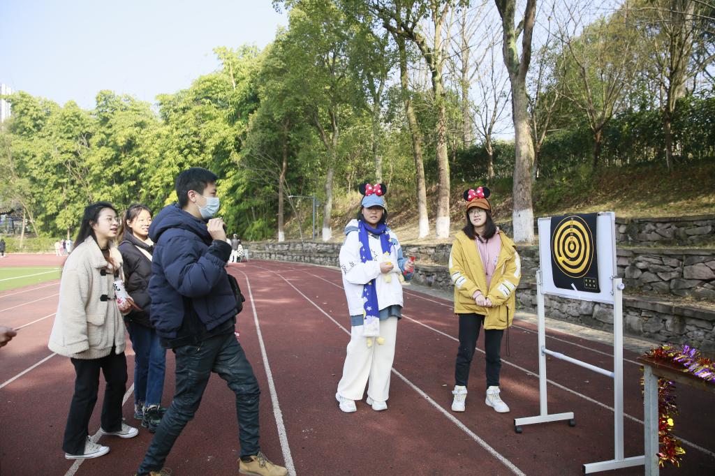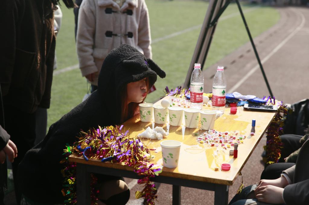 本次新春游园会集结了各二级学院学生会组织共同策划、参与,为同学们精心准备了12个趣味项目,既有有满载童年回忆的贴鼻子、纸飞机梦,也有充满竞技性的趣味保龄球、和平精英等。由公共艺术学院负责的“吹球入碗”既考验参与者的气息掌握又考验心理素质;大学生艺术团负责的“定点投篮”项目则充分考验参与者的眼力和投掷技巧。