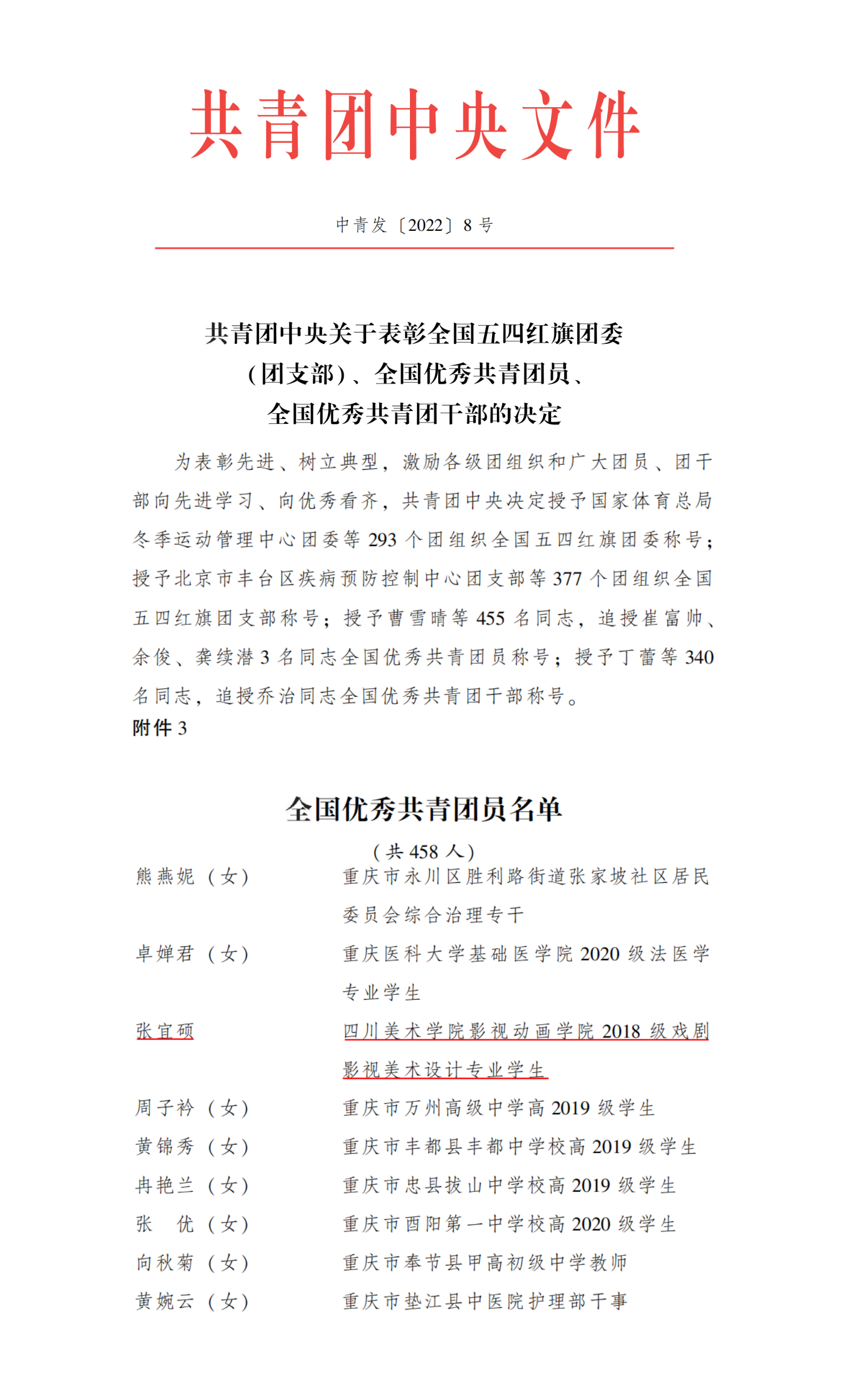 2022年是中国共青团成立100周年。近日,共青团中央作出表彰决定,授予293个团组织“全国五四红旗团委”称号,授予377个团组织“全国五四红旗团支部”称号,授予457人(含追授3人)“全国优秀共青团员”称号,授予341人(含追授1人)“全国优秀共青团干部”称号。其中,我校影视动画学院学生张宜硕获评“全国优秀共青团员”殊荣。