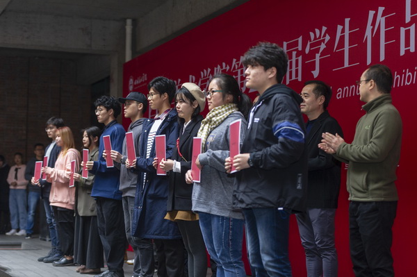 开幕式上,首先进行了年展优秀作品颁奖。黄云宣读了本届本科学生作品年展获奖作品名单。本届年展共入选302件,经过学院推荐,学校专家组评审,60件作品获优秀奖,其中,美术学类作品24件,艺术设计类作品22件,影视动画类作品10件,优秀论文4篇。主席台领导为获奖学生代表颁奖。