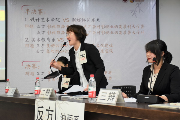 辩字当头,论衡天下,莫论胜负英雄!设计艺术学院与新媒体艺术系就“影视作品中的‘植入式广告’对影视业的发展究竟利弊如何”展开辩论;美术教育系与油画系就“良好的知识产权秩序重在文化建设还是制度建设”展开辩论。决赛席上,各系的队员锋芒毕露,现场气氛热烈。每当精彩的辩词被陈述后总能听见观众席传来的阵阵热烈掌声。最后,设计艺术学院与油画系就“贫困人口精准脱贫’扶智’与’扶志’哪个更重要”进行最终角逐。