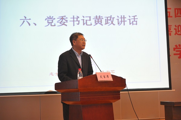 最后,党委书记黄政作重要讲话,他首先代表学校党委向受到表彰的先进个人、集体表示热烈祝贺!向全体青年团员致以节日的问候,向长期以来关心青年成长、致力于青年事业的同志们表示衷心的感谢!他讲到,今年学校持续深入开展“质量建设年“工作,本科教学评估迎评促建、申博工作进入攻坚阶段,在建设“双一流”的时代背景下,全校师生上下齐心,拧成一股绳,正是创一流大学,励精图治凝心聚力;建一流学科,青云之志赤子之心。他讲到,最近教育部部长陈宝生同志、市委副书记唐良志同志先后到美院考察调研,他们对我校坚持以人民为中心的创作导向;我校“生态重建、乡土再造、地方记忆”的建设做法;以主题创作为抓手,加强和改进新形势下思想政治教育工作;我校高等艺术院校创新创业教育特色化发展思路都给予了高度的肯定和赞赏。黄书记用四句诗词向全校青年学生、团员青年殷切寄语,1、三更灯火五更鸡,正是少年读书时。同学们正处于人生美好的时光,正处于川美美丽的校园。学习知识、充实自我毋庸置疑是第一要务。 “花有重开日,人无再少年”,切莫把宝贵时间光阴虚掷。2、千磨万击还坚劲,任尔东西南北风。川美的强大底蕴可以包容各种理想,但是通向理想的路崎岖坎坷,需要我们立足现实,从一张素描作业,一张基础的设计图纸、上好每一堂课开始起步,奠基。3、随人作计终后人,自成一家始逼真。在川美,提倡奇思妙想、提倡“无中生有”,又兼收并蓄、博采众长。文艺创作方法有一百条、一千条,但最根本、最关键、最牢靠的办法是扎根人民、扎根生活。4、苟利国家生死以,岂因祸福避趋之。川美校训是“志于道,游于艺。”我们川美青年应该有国家至上、民族至上、人民至上的情怀,始终胸怀大局、心有大我。黄书记强调,今年是建团95周年,不忘初心跟党走是中国共产主义青年团95年的基本遵循。“不忘历史才能开辟未来,善于继承才能善于创新。”坚守不容易,追求无止境,他鼓励全体青年学生、团员青年更创佳绩,续写光荣。