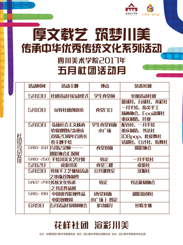 作为“厚文载艺,筑梦川美”传承中华优秀传统文化系列活动之一, 本次社团活动月将持续一个月时间,将举行玩转社团创意坊、手绘川美文艺比赛、传统手工艺体验、中国优秀影视作品放映周、书法作品展、桌游川美等一系列精彩纷呈的活动。
