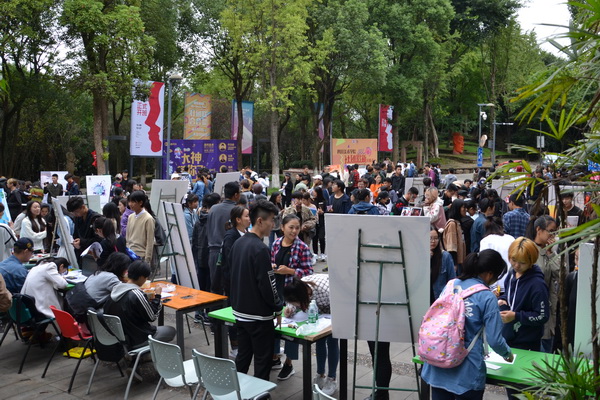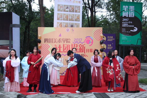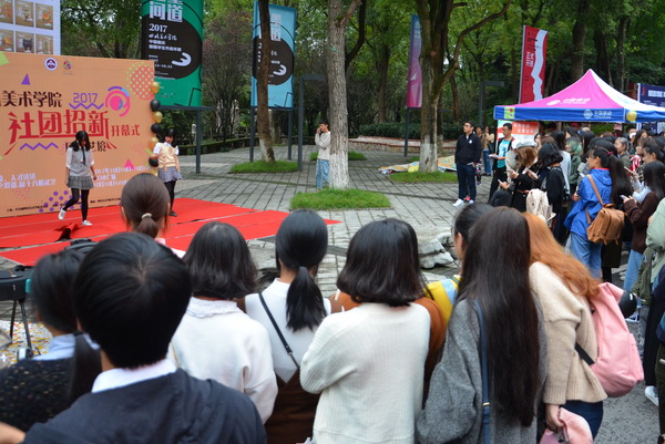 为展示我校学生社团的风采,扩大学生社团的校园影响力,为学生社团的可持续发展注入新鲜血液,10月11日下午,由校团委主办、社团联合会承办的2017年四川美术学院“团盈艺境”社团招新开幕式在学生食堂小广场举行,全面启动了为期三天的2017年学生社团招新活动。学校党委常委、副校长彭林权亲临活动现场,对学生社团的建设与发展提出了宝贵意见。