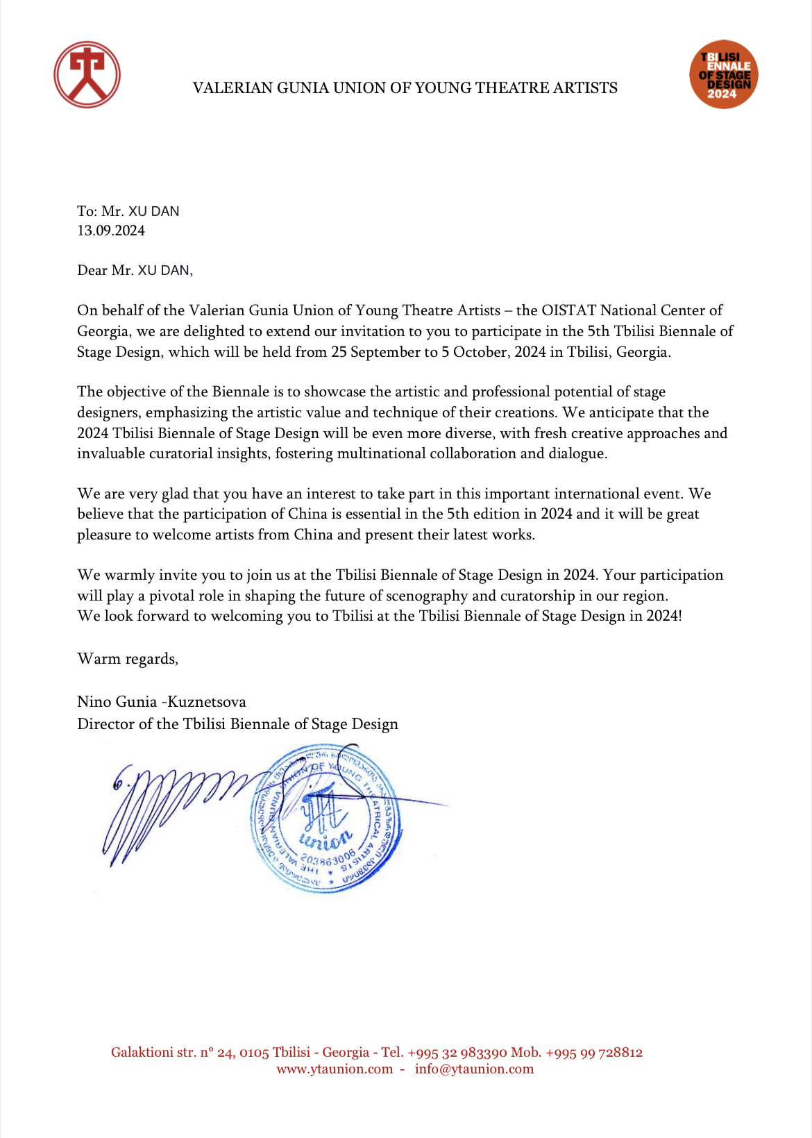 第五届“第比利斯国际舞美双年展”将于9月25日-10月5日在格鲁吉亚首都第比利斯举行,展览汇集了来自欧洲、亚洲、美洲等多个国家和地区的优秀作品。该双年展由瓦莱里安·古尼亚青年戏剧艺术家学会——格鲁吉亚国际舞美组织中心组织。