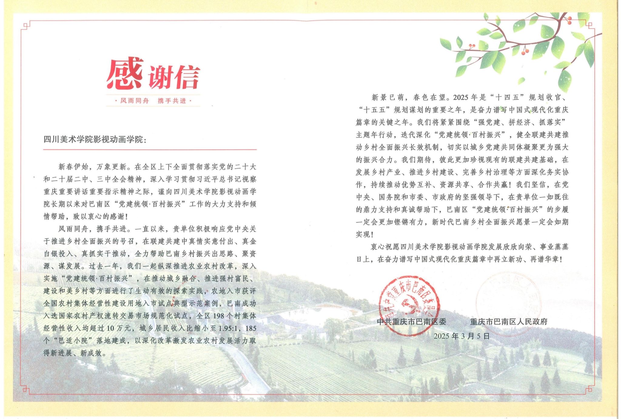 近日,中共重庆市巴南区委、重庆市巴南区人民政府向我校发来感谢信。感谢我校对巴南区“党建统领·百村振兴”工作的大力支持和倾情帮助,并期待双方能珍视现有的联建共建基地,在发展乡村产业、推进乡村建设、完善乡村治理等方面深化务实协作,持续推动优势互补、资源共享、合作共赢,为建设美丽新重庆做出更大的贡献。
