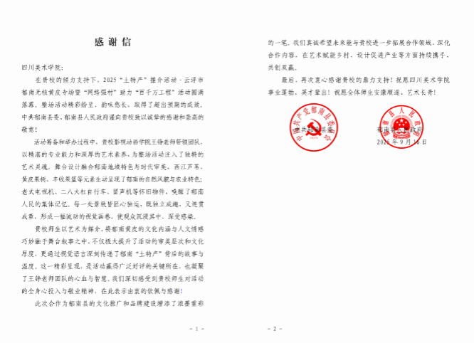 此次合作充分体现了我校服务社会、赋能地方的责任担当。学校将继续发挥艺术设计专业优势,深化校地合作,为推动“百千万工程”实施和乡村振兴贡献更多川美智慧与力量。