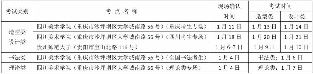 1、书法类专业:我校不在其他省市另设考点,全国考生均需到四川美术学院(重庆市沙坪坝区大学城南路56号)参加1月6日的考试。