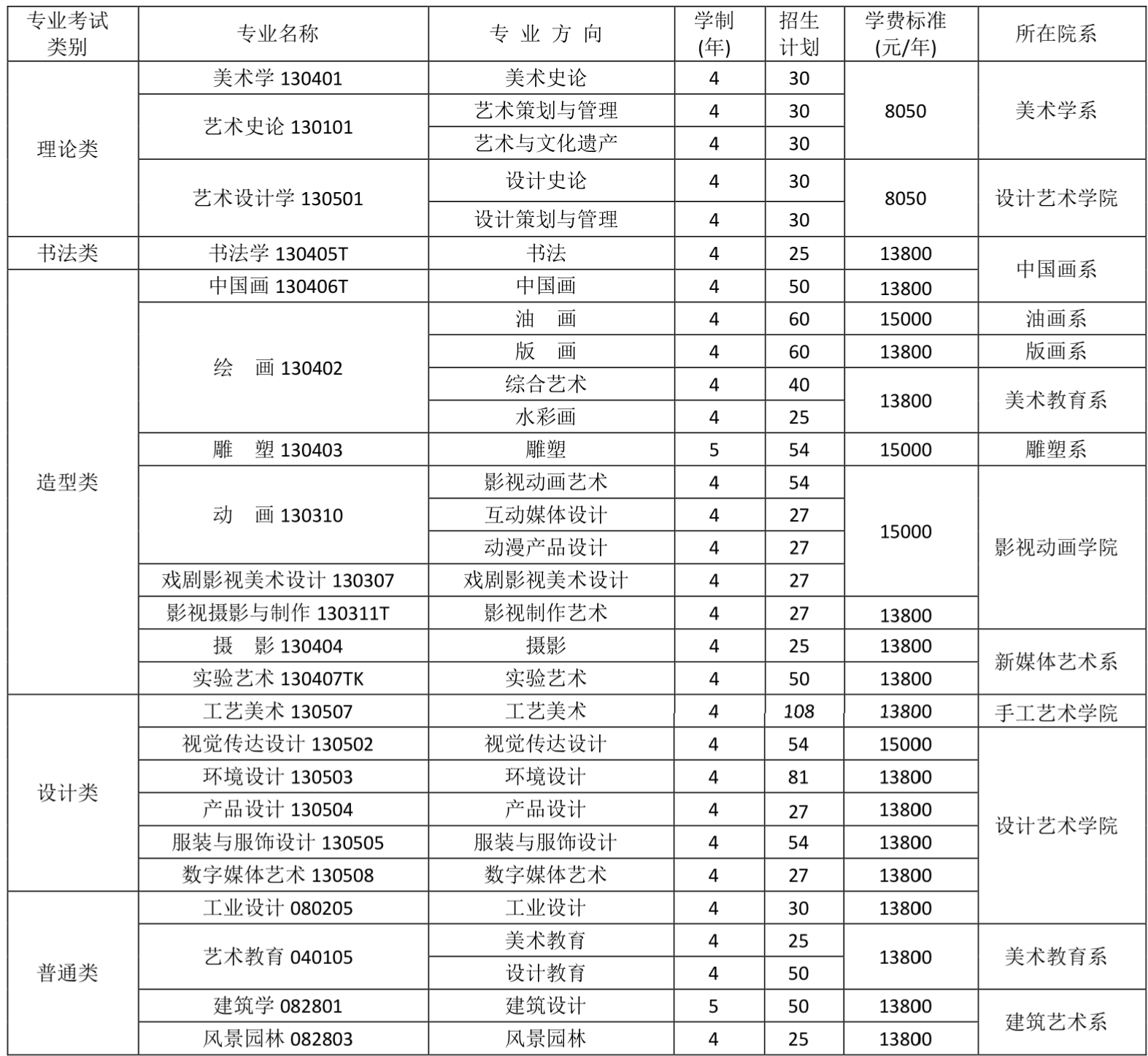 注:①招生专业、计划及收费标准以上级主管部门下达的为准;②住宿费每人1200元/年(四人间)。③各院系及专业(方向)介绍,请关注四川美术学院招生网和各院系网站。