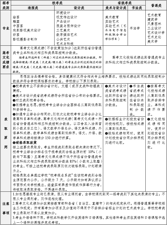 校考类专业不安排分省计划,按以下原则全国排名录取:校考类专业均文理(或历史类和物理类)兼招,考生符合报考条件,美术与设计类省统考成绩符合所在省份公布的合格要求,对应类别校考合格,高考文化课成绩达到所在省份普通类专业本科批次相应科类录取控制分数线,依据考生志愿,按校考专业综合分从高到低录取和安排专业,专业综合分计算方法同前。