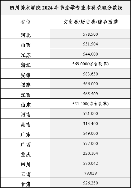 书法学专业2024年首次编制分省分专业计划,纳入省统考批次录取,仅提供2024年录取分数线作参考。