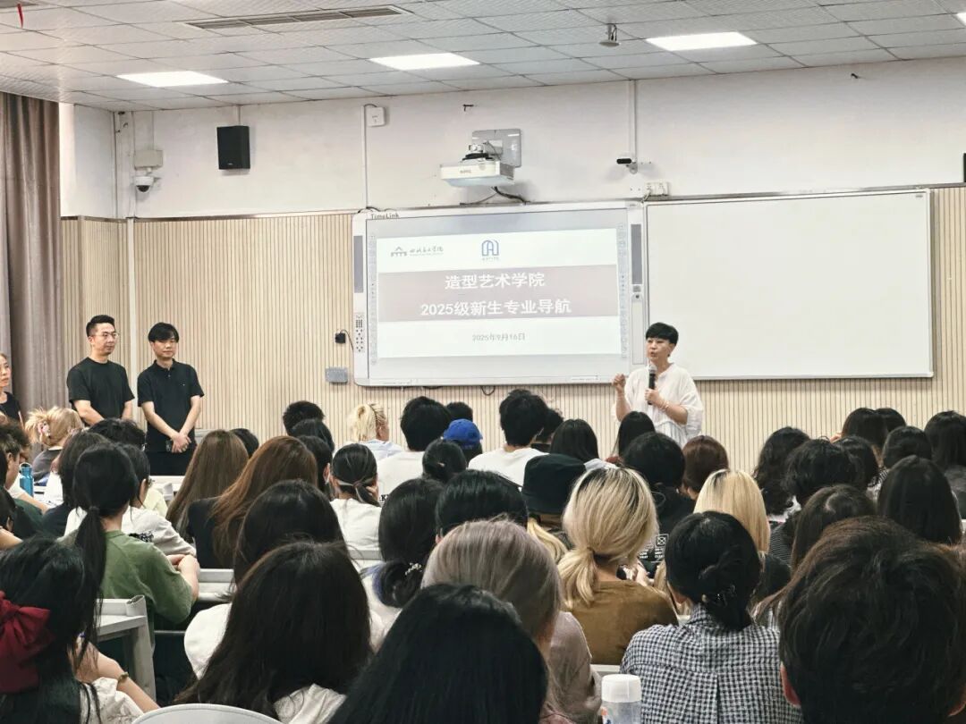 2025年9月16日14时,造型艺术学院2025级新生专业导航在绘画楼HB211教室举行。此次活动由造型艺术学院副院长熊莉钧教授主持,油画系副主任赵文悦、版画系副主任臧亮、雕塑系副主任尹代波、水彩画系主任包蕾做详细讲解。