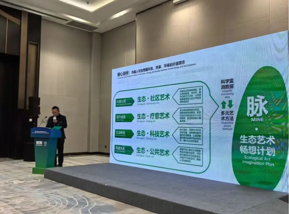 在边会报告环节,张翔老师以《MAB野生动物监测之生态艺术解决方案》为题,提出生态艺术参与生物多样性保护的路径,通过与中国生物圈保护区网络和中国科学院相关单位开展合作研究,并通过多元艺术形式转化野生动物监测数据,践行人与生物圈“共生、共享、平等”理念,强调以理性、智性与科学性为原则,推动具有广泛参与性、公共性、共创性的生态艺术和科普教育实践。