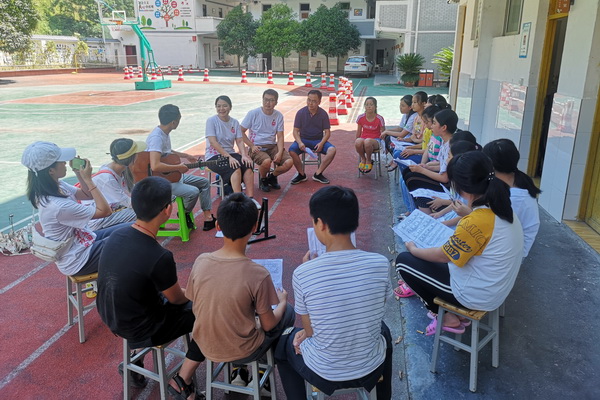 在天元乡天元中心小学,天元村的驻村扶贫队员李申平老师正在给小学生们教授吉他课。他发挥自己的业余特长,在天元乡自费开办了公益吉他培训班,把扶贫与扶智、扶志相结合起来,用文艺传递爱,用音符播撒美的种子。实践队员在李老师的协助下,与小学生们即兴开展了“大手牵小手,为青春欢唱”活动,实践队员、四川美院校学生会、大学生艺术团的大学生与小学生们共同演唱了校园民谣,并为他们表演了精美的舞蹈,在一曲充满不舍之情的“送别”合唱歌声中,小朋友们露出了欢快的笑容。