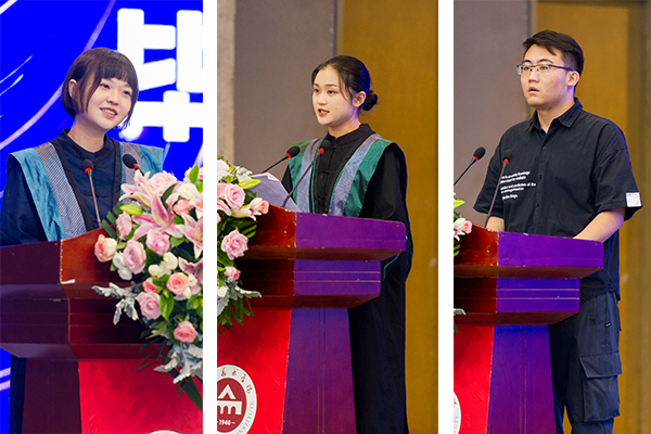 教师代表黄越教授、家长代表胡雪莲女士、毕业研究生代表卓文佳同学、毕业本科生代表钱德珍同学、在校生代表曾嘉轩同学先后作了热情洋溢的发言。