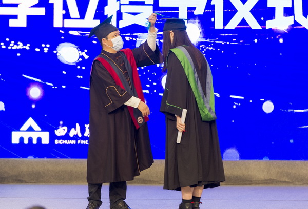 在主持毕业典礼的过程中,党委副书记左益号召所有毕业生牢记“志于道 游于艺”的川美校训,立志成为高素质、创新性、实践型艺术英才,充分发挥艺术服务国家战略、服务人民生活的重要作用,创作出无愧于时代的艺术精品,在塑造自己美丽人生的同时,为美丽中国建设贡献自己的青春力量。