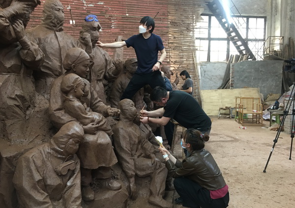雕塑系的教学团队,从本次主题创作方案的提出、修改、泥塑、捶打、塑形,人物刻画,样样不落,亲力亲为,常常戴着口罩,在重庆只有10度左右的气温下大汗淋漓,湿透衣衫。学生看在眼里,感动在心里。“老师们以身作则,遇事则教让我深受感动。在疫情中学习雕塑由于时间和材料方面有诸多不便,有时会感到迷茫无助。但敬爱的老师为我们上了很好的一堂专业课,用实际行动让我体会到艺术学习离不开对生活切实感受的思考,更不能置身于社会现实之外,我们应该担当起更多时代赋予这一代人的责任。作为川美雕塑系的学生是幸福的。”雕塑系学生赵强如是说。
