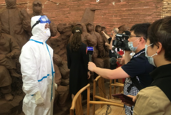 见面会开始之前,医护人员换上在湖北抗疫一线“战斗”的专业防护服,配合群雕创作团队进行作品的进一步深度刻画。焦兴涛副校长为出席领导和媒体记者们现场讲解了该群雕作品的整体创作情况。