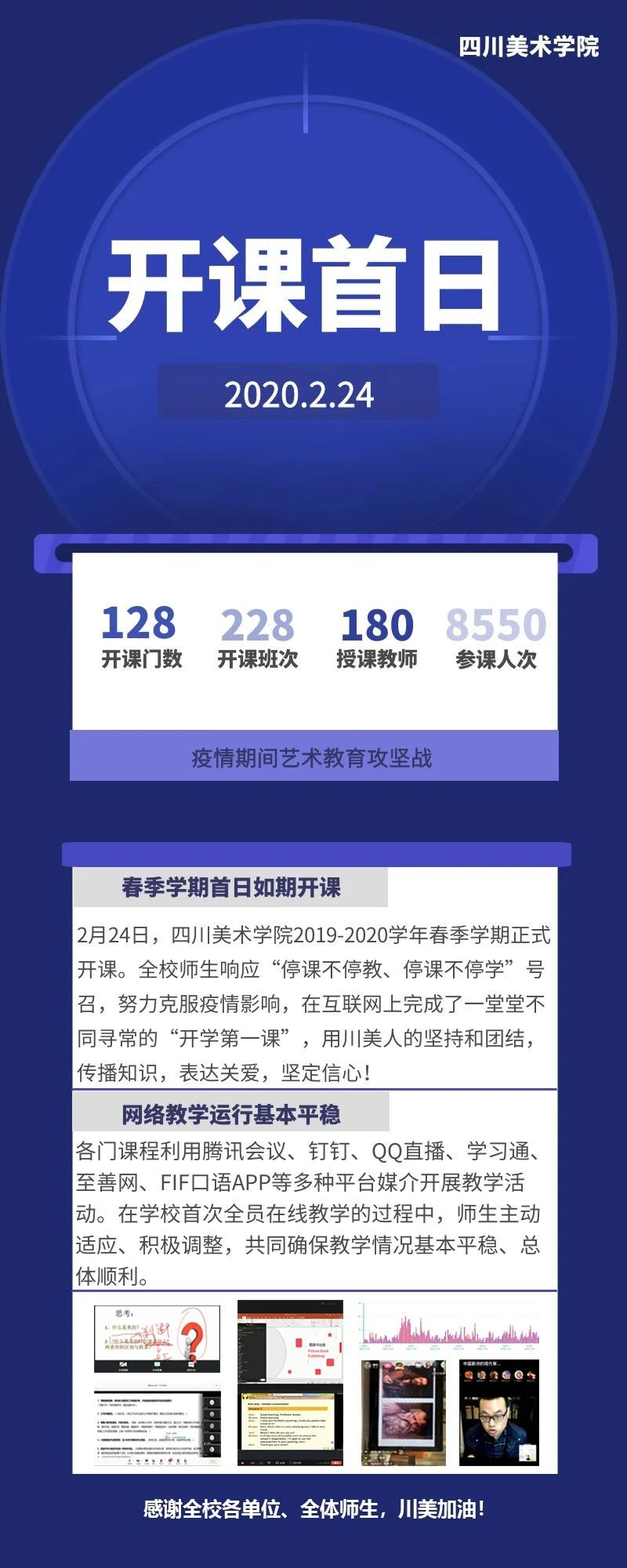 2月24日,四川美术学院2019-2020学年春季学期正式开课。全校师生响应“停课不停教、停课不停学”号召,努力克服疫情影响,在互联网上完成了一堂堂不同寻常的“开学第一课”,用川美人的坚持和团结,传播知识,表达关爱,坚定信心!