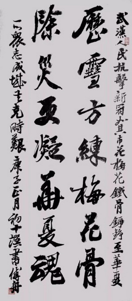 学校九三学社社员、书法家付舟教授挥毫写下《历雪除灾联》、篆刻《大爱无疆》(附图2),表达华夏一心、众志成城、共克时艰。