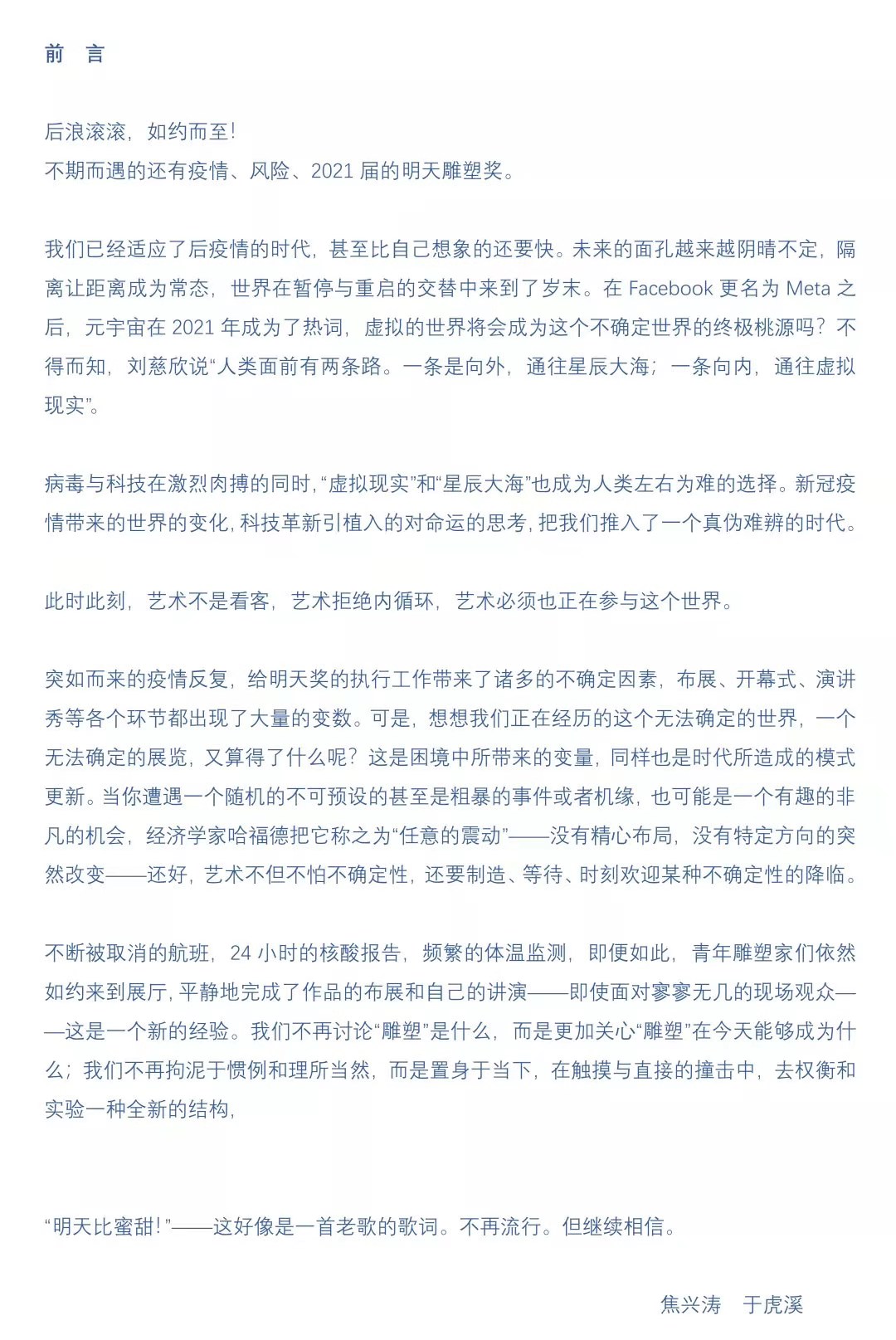 第九届“明天雕塑奖”入围暨获奖作品展于2021年11月19日在四川美术学院造型艺术学院美术馆(雕塑系)开幕,展览将持续至2021年12月19日。为配合国家及有关部门加强疫情防控的要求,本次展览开幕式与“2021五粮液『明天雕塑奖』艺术新星演讲秀暨颁奖典礼”均采取“线上+线下”的形式,展览的对外展示主要通过线上进行。主办方、赞助方与评委通过视频致辞,艺术家们则将通过视频讲述自我的艺术历程、创作心得以及对生活和时代的感悟。