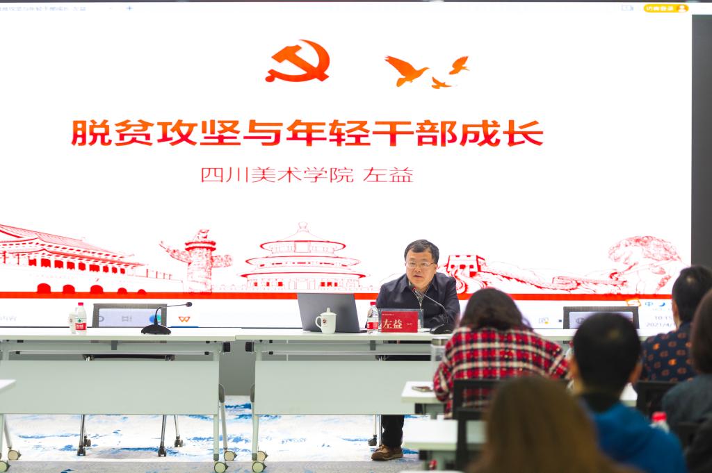 左益书记作了《脱贫攻坚与年轻干部成长》的专题报告,从三个方面进行了解读。第一个方面详细阐述了脱贫攻坚战取得全面胜利的重大意义和宝贵经验,通过大量的图片和事例分析了川美在脱贫攻坚所采取的行动。第二个方面讲述了习近平总书记对年轻干部的谆谆教诲,解读了习近平总书记要求的好干部20字标准:信念坚定、为民服务、勤劳务实、敢于担当、清正廉洁。第三个方面以大量鲜活的事例讲述了年轻干部在脱贫攻坚中的锻炼成长。